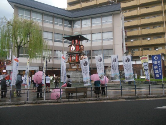 写真は24日の道後温泉からくり時計。丁度4時半でからくり時計が動き始めた時だった。雨傘と柳の木、雨の道後も風情があった。