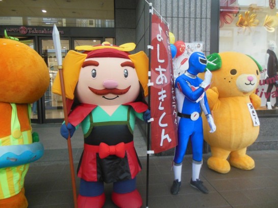 昨日から共同募金が始まり、市駅前にはそれを宣伝する松山のゆるキャラが集合していた。正面の「よしあきくん」と右端の「みきゃん」はよく知っているが、他は知らない。宣伝不足かもしれないが、要するにゆるキャラも作りすぎだと思う。