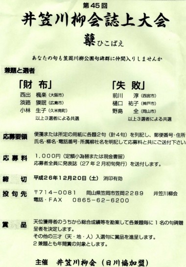 井笠川柳会は毎年4回の大会があって、天の句には句碑になるチャンスがある。次回の題は「財布」と「失敗」。皆さん、句碑を目指して投句してみて下さい。