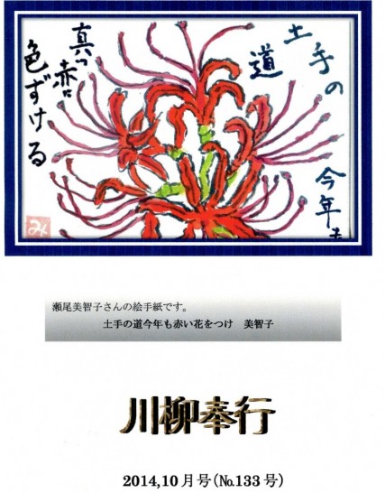 川柳奉行が届いた。今月の表紙は彼岸花。美智子さんいつも美しい絵手紙をありがとうございます。・土手の道今年も赤い花をつけ 美智子彼岸花を見ると私は丸亀に住んでいた頃、彼岸花の根を餌に飯蛸を釣ったことを思い出す。思い出はいつも美しい。今回の印象吟の私の句は・千羽鶴今もどこかである戦・鶴を折る心も水も澄んでくる印象吟は頭を柔らかくしてくれる。賢悟さんありがとうございました。今日はノラの会。大いに笑って皆さんからパワーを貰いたい。