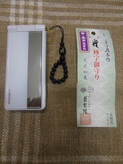 先日家内が行って宿泊した高野山普賢院で種字御守り(ストラップ)を買ってきてくれた。一年を掛けて遍路をした集大成の証になる。私は未年生まれだから守護仏は大日如来。早速ガラケーに付けた。これからの私を守ってくれることだろう。大切にしたい。