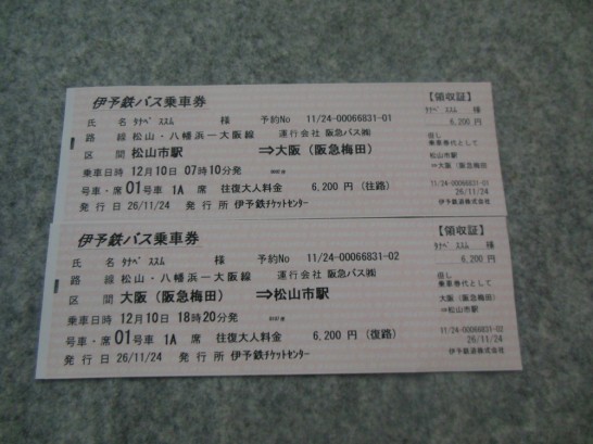 12月10日に大阪で日川協の常任幹事会があるので、バスのチケットを購入しに行った。伊予鉄のバスセンターの受付へ行くと若くて美しい女性が笑顔で迎えてくれる。これも松山のおもてなしの一つだろう。「大阪行きの切符を下さい」「いつですか」「12月10日です」。用紙に手際よく記入しながら時刻表を見せて「出発は何時ですか」「7時10分です」「お帰りは」「同じ日の18時20分です」「お席はどこを希望されますか?今ならどこでも空いていますが」。ということは私が1番ということ。最近はバスの利用者も少なくなってきたのか?。「じゃあ1Aでお願いします。「お帰りはどの席にされますか?、こちらも今ならどの席も空いています」「じゃあ同じく1Aでおねがいします」「金額は12600円です」。1万5000円を渡すと、すぐに「お釣りです」といって2400円が帰って来た。お釣りを受け取ると同時に「大変お待たせをいたしました、これがチケットです、内容をお確かめ下さい」と言って、チケットが出てきた。私は全く待たされていないので笑いながら「全然待ってはいませんよ」と言ったが、その意味は通じなかった。彼女はマニュアルどおり喋っているのだろう。機械処理の速さと言葉の間にずれを感じた面白い一幕だった。