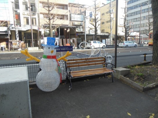 伊予鉄高島屋から南堀端に至る花園町は今の時期、イルミネーションで飾られる。名付けて「イルミナーレ花園2014」。椅子に座って写真をどうぞと雪だるまも言っているが昼間は誰も座らない。このように趣向を凝らしたものが他にも多く置かれていて夜はLEDが美しく輝く。これも修二さんのお蔭だ。修二さんありがとう。今日は今年最後の川柳ノラの会。これで私の実質上の仕事納めとなる。