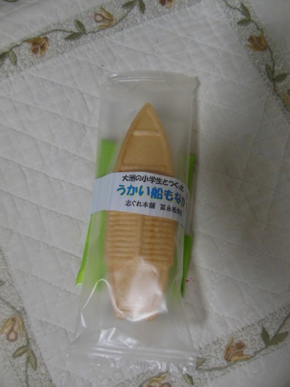 写真はお土産に貰った「うかい船もなか」。毎年肱川で行われる鵜飼の船をかたどったもなか。甘党の私にはうれしい。