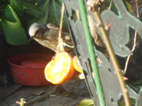モチノキの実を食べ尽くしたヒヨは畑へ行き、野菜をつつき、それも食べ尽くして、食べるものが無くなると最後はメジロのブランコのミカンに目を付けた。今までは諦めていたが、食べる物が無くなれば仕方がない。訓練に訓練を重ねついにブランコのミカンを食べることに成功した。ヒヨの根性に拍手を送りたい。やればできるとヒヨが教えてくれている。