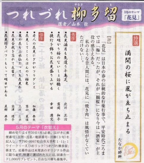 同じく愛媛新聞社発行のフリーペーパー「ウイークリーえひめリック」にも「つれづれ柳多留」と称して隔週、川柳のコーナーがある。