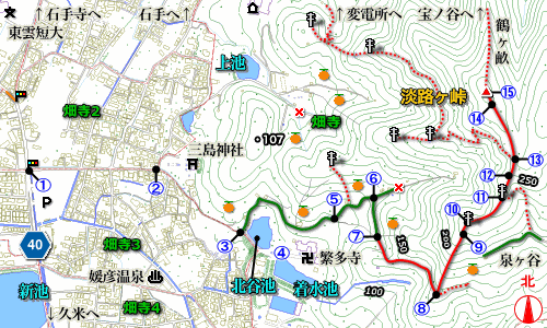 淡路ヶ峠の高さは275mで登山という程ではないが、体力が低下している私にとっては最高の体力テストになる。天気も良く、一度も休むことなく、一気に頂上まで登ることができた。頂上からの見晴らしは最高で、瀬戸内海、松山城、総合公園、道後温泉、石手寺などを眼下に見ることができた。