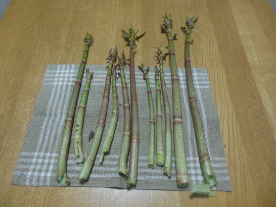 いたどりは子供の頃、弁当のおかずにもなっていました。道を歩いていて見つけたら直ぐに採って皮をむいて、よく食べたものです。そのことを孫に話したらびっくりしていました。皮をむいて食べさせたら、まんざらでもないようでした。愛媛ではあまり食べないようですね。