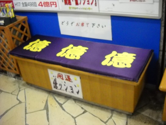 ということで、昨日ノラの会の帰りマツチカで宝くじを購入した。購入後当たりますようにと側にあった「億ッション」にも座ってきた。やることは全てやった。後は天命を待つのみ!!!!。