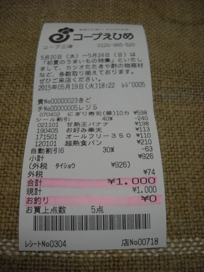 19日、家内が山へ行っている時、久し振りに近くのスーパーで買い物をした。考えてみれば私がスーパーへ行くのはこういう時しかない。色々食料を調達して、レジの表示を見てびっくり。1000円ピッタリだった。店員さんも「これは珍しい」と言っておられた。「何か記念品はないのですか」と尋ねたら、「ありません」と一言。「宝くじを買えば当たるかもしれませんね」と助言された。
