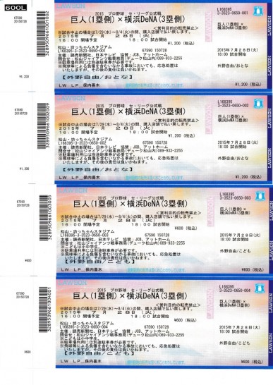 7月28日(火)坊っちゃんスタジアムで巨人ーDeNAの試合がある。丁度夏休みで二人の孫が見に来ることになった。こうなると爺婆の出番!!。チケット発売の23日10時前に家内はコンビニへ走ってチケットを購入してきた(写真)。便利な世の中になったものだ。コンビニで何でも買える。