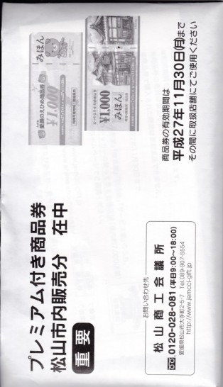 松山市が発行していたプレミアム商品券が漸く届いた。7月1日から使えるということで、1日のテレビには早速その商品券を使って買い物をする人が映っていた。我が家には届いていないのでおかしいなと思っていたら、松山市以外は直接手渡しで商品券を受け取り、松山市のみ郵送ということらしい。その内届くだろうと思っていたが一向に届かないので心配していたら、担当部所から「7月26日にまでにはお届けできる」というメール。それでは遅いのでは思っていたら「お急ぎの方は郵便局の窓口でお渡しできます」とのメール。わざわざ行くことも無いと思っていたら今度は「松山市の中心部の会場でお渡しいたします」とのメール。このバタバタした様子はテレビでも報じられ、怒ったお客が担当者と言い合っていた。私は気長(家内も居ないので)に待てばいいと思っていたら、昨日その商品券が無事郵送されてきた。やれやれ。