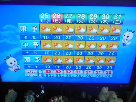 昨日四国地方の梅雨が明けた。別に気象台が言わなくても空の色を見れば分かる。真っ青な青空で太陽がギラギラ。ようやく夏が来たという感じだ。愛媛の週間天気予報もこれから一週間は晴れ晴れ晴れ・・・・。完司さんの真似をしてテレビの画面をパチリ!!。竜宮の結果も異状なく、心も梅雨明けという感じだ。高齢者はこまめに水分を補給してこの夏を乗り切らねばならない。・迎え撃つ夏 水分を補給して今日は溜まっている仕事を一つづつ片付けていく。高校野球も相撲もゴルフも面白くなってきた!!!。