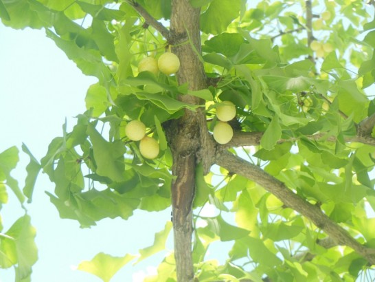 写真は一昨日見た平和通りの公孫樹並木。春には濃い緑で埋められていたが、今は暑さの所為だろうか黄色くなりかけた木がある。公孫樹を見る限り秋を予感させる。近付いて上を見るとびっしりとギンナンが付いていた。少し早すぎ
