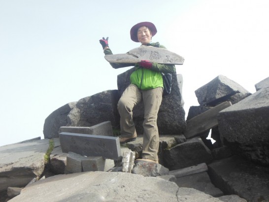 写真上は月山の頂上付近、頂上はロープが張られていて立ち入り禁止になっているため、ぎりぎりのところで手製の標識を持ってパチリ。