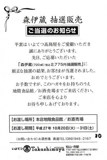酒好きなのにこの「森伊蔵」って知らないです。(日本酒ですか?)抽選で買うくらいですから美味しいお酒なのでしょうね。愛媛大会に行ったらひと口御馳走して下さいよ~。