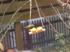 庭の木の枝に刺しているみかんをヒヨには食べられずにメジロにだけ食べさす方法はないものか???。二宮茂男さんご推奨のドウダンツツジは我が家には無いしと思案に暮れていたら友人がブランコを推奨してくれた。かまぼこ板にくぎを刺してブランコを作り、それにみかんを刺しておくと、ヒヨは大きいので乗れないがメジロは...