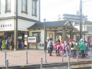 昨日のキッズカーニバル川柳吟行は好天に恵まれ最高の一日になった。全員が市駅から電車に乗り道後温泉に到着した。道後温泉では待ち構えていた観光ボランティアの人から道後温泉のこと、坊っちゃん列車のこと、からくり時計のことなどの説明があり、子供たちは熱心にメモを取っていた。