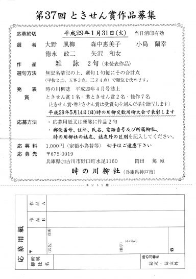 先の徳島川柳大会で矢沢和女さんから「第37回 ときせん賞作品募集」の案内を頂いたので紹介しておきます。 その時一緒に「月刊 時の川柳」と「野火の会々報」もいただいた。いずれにも先の全日本川柳愛媛大会の事を「巻頭言」と「エッセー」に書かれている。 皆さんそれぞれ色色な思い出を作られたことが主催者側とし...