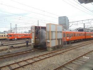 私がよく利用する伊予鉄古町駅は伊予鉄の車両基地になっていて、ホームのすぐ近くに洗車機がある。車の洗車機と同じだが今まで動いているところを見たことが無かった。一度見てみたいと思っていたら、昨日の帰りに初めて見ることができた。左に立っている人がスイッチを入れると水が噴射し、中のモップが回転する。そこへ電...