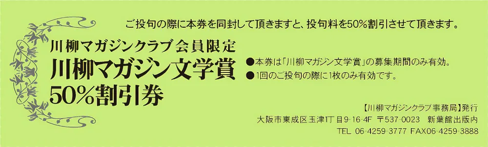 「川柳マガジン文学賞」の投句用紙(こちらより)と、下記の「川柳マガジンクラブ優待券」をプリントアウトして、ご使用ください。 複数投句可です。 文学賞の締切は、川柳マガジンまたはWebの要項をご確認ください。