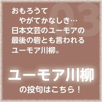 まだ、時代が徳川幕府だったころ、江戸の町に前句付(川柳の前身)という懸賞のついた五七五が流行し、人々を楽しませていた。その前句付は今、「川柳」という名称の文芸となり、現在もたくさんの人を楽しませている。