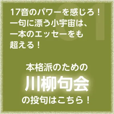 ここは、川柳の醍醐味である「川柳句会」の楽しさを知らない不幸な君たちへ、また、思いっきり川柳を堪能しているあなたにも贈る、新葉館Web川柳句会場!